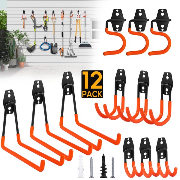 Donext Garage Hooks, 12 Pack Heavy Duty Steel Utility Hooks for Hanging, Wall Mount Garage Storage Hooks for Tools, Ladders, Bikes, Bulky Items, Orange