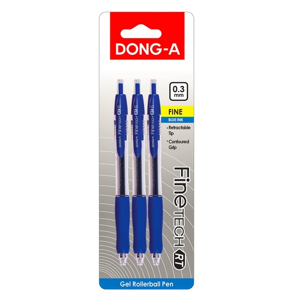 DONG-A Fine-Tech RT, Gel Ink Roller Ball Pens, 0.3mm, Retractable (3-Pack, Blue)