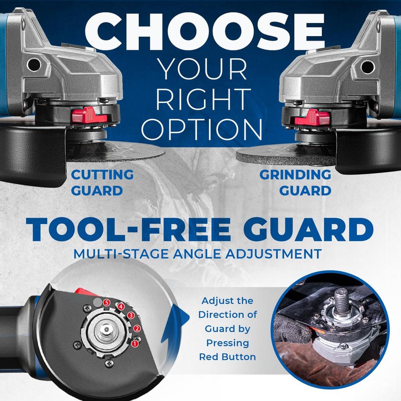 • Tool-Free 360 Adjustable Guard: The tool-free guard can be easily adjusted to any angle without additional tools, offering flexibility and enhanced protection during operation.