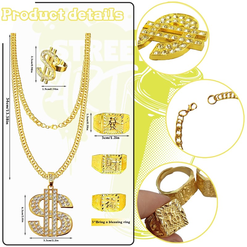 - Complete Hip-Hop Set: The set includes 1 pair of earrings, 1 dollar necklace, 1 thick gold necklace, 1 bracelet, 1 dollar ring, 3 lucky character rings, and 1 pair of hip-hop sunglasses. No additional accessories needed—effortlessly create your own unique hip-hop style