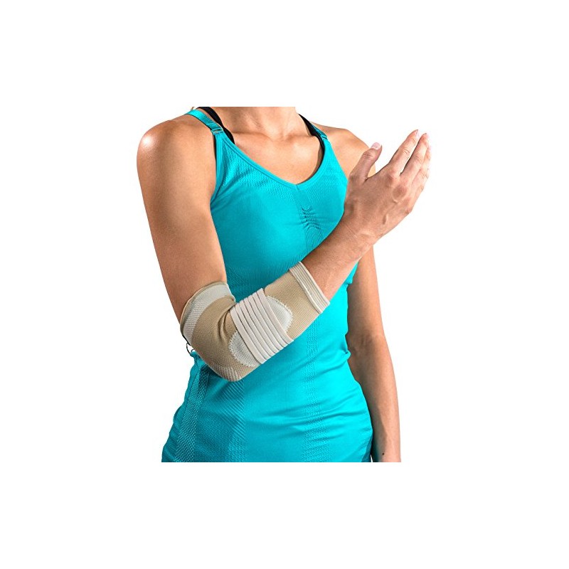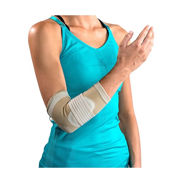 DonJoy Advantage Deluxe elastic elbow for sprains, strains, golfer's and Tennis elbow, swelling, tendonitis - dual silicone pads, elastic straps for pain Relief and compression, tan, medium 9" - 10.5".
