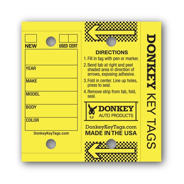 Donkey Key Tags - Half Pack - Laminated Self-Protecting (125 Tags Per Box with Metal Rings) (Yellow)