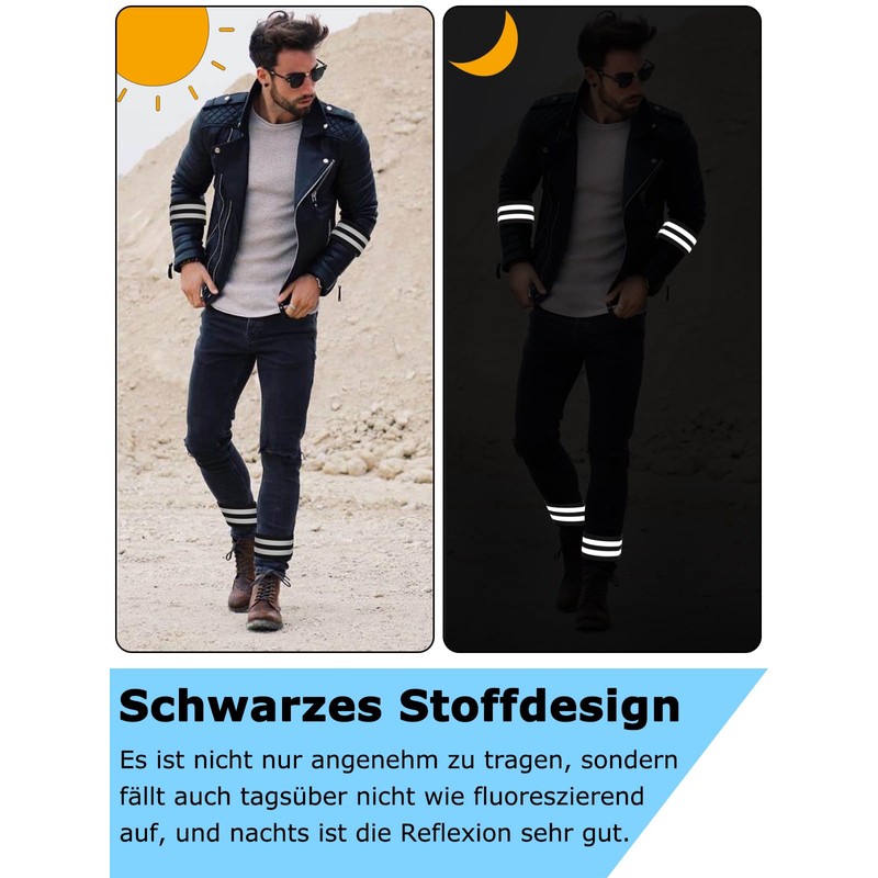 - Black fabric design, discreet to wear during the day: the reflective tape is made of black fabric and white double reflective tape. It is not only comfortable to wear, but also does not stand out like fluorescent during the day, and at night the reflection is very good