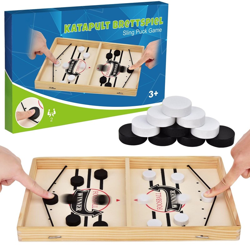 - Two-player game – simple rules: includes 1 board, 10 pieces pucks. Players use rubber bands to spin the puck out of the door until there is no puck left on one side. Whoever clears the board first wins!