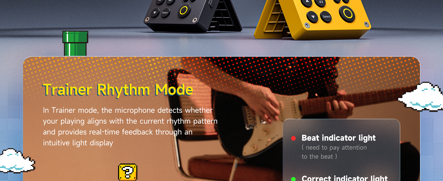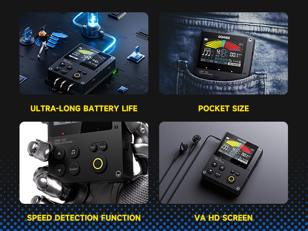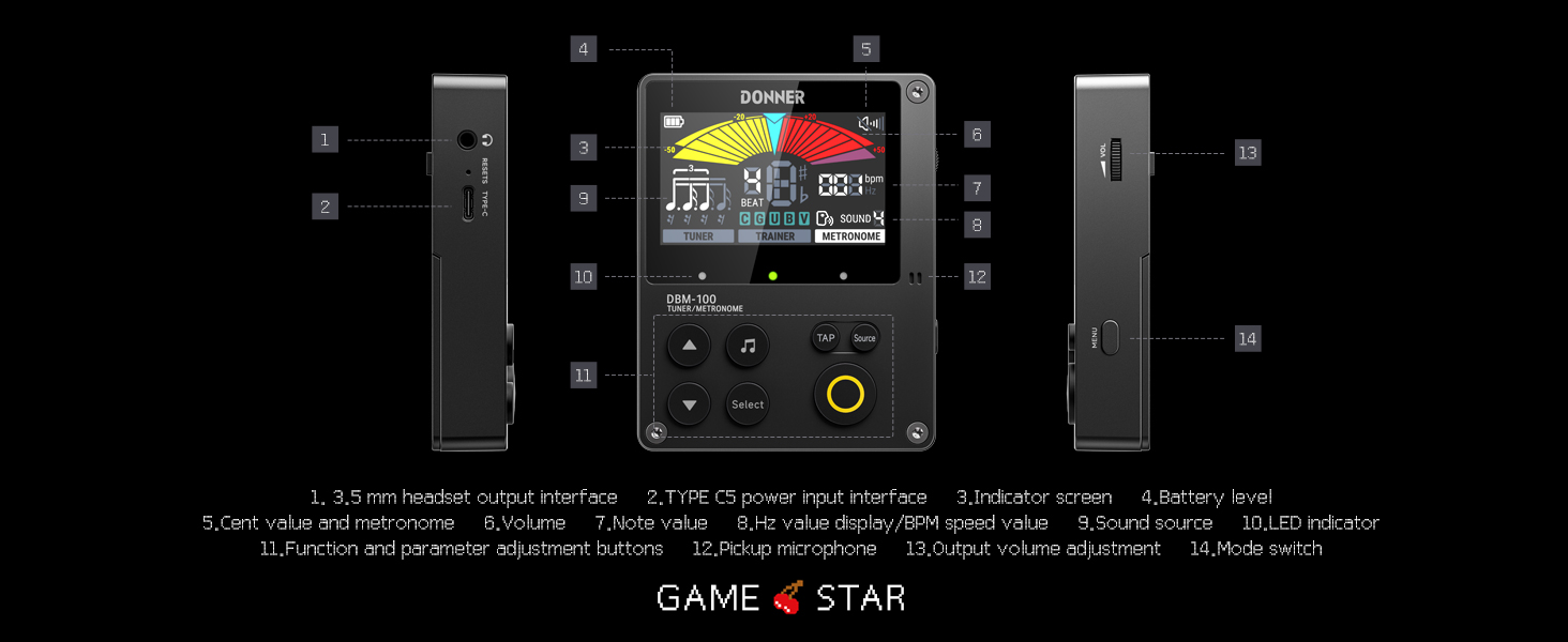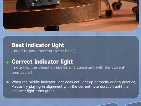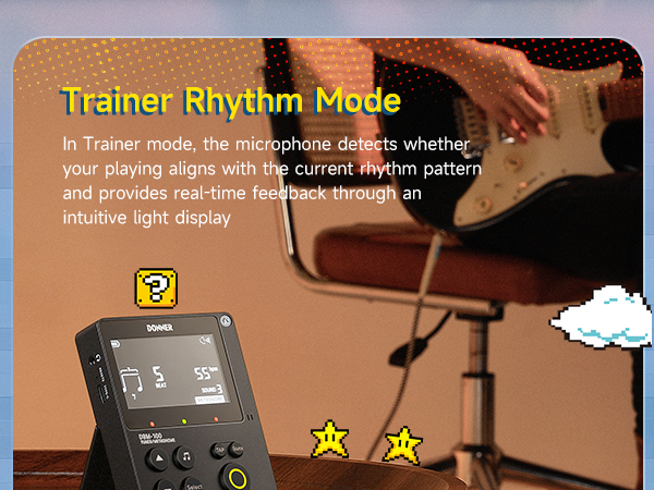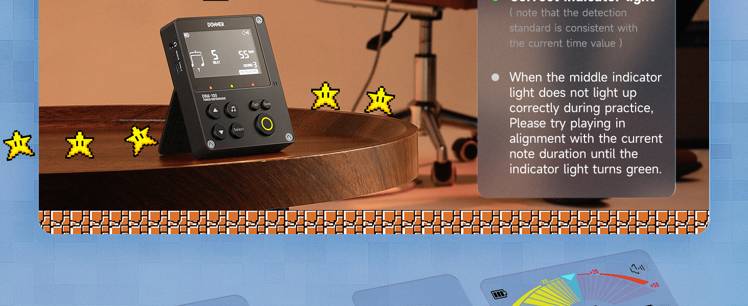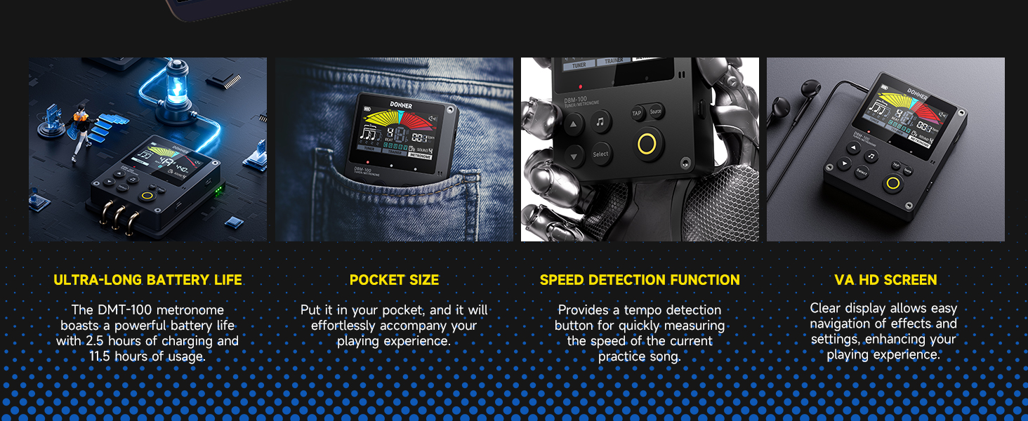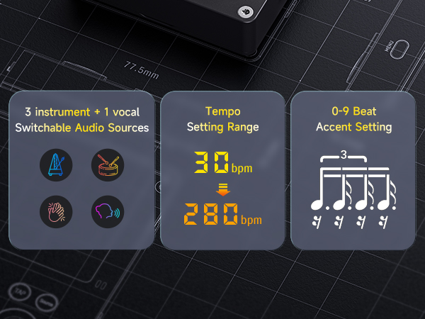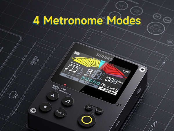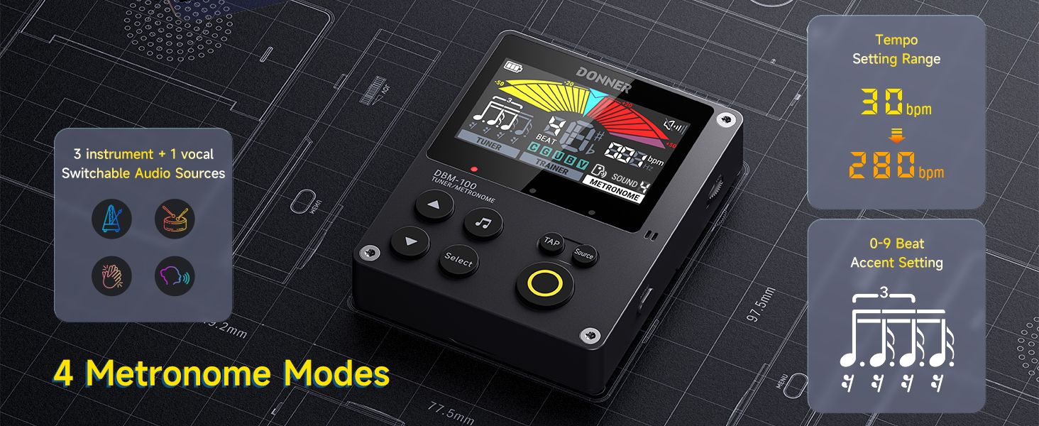 【 Training Rhythm Mode 】The Donner DBM-100 tuner metronome features an innovative training rhythm mode. The built-in microphone detects whether your sound matches the current rhythm and provides dynamic feedback through a light display. Blind rhythm tests help improve timing accuracy.