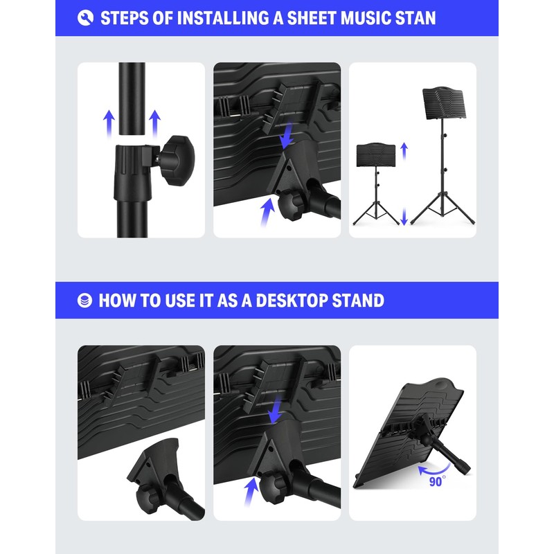 - Portable and Foldable designed: Black foldable bookplate and steel music stand is very easy to carry and stock, and come with a carrying bag for long-term or temporary use.