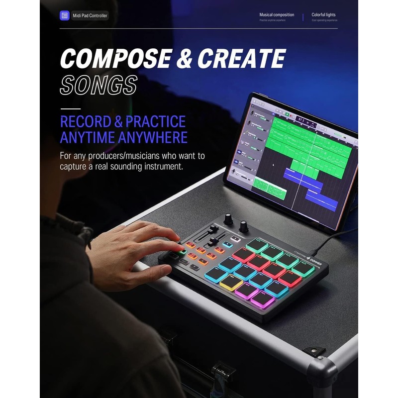 • Excellent Playing Experience: Tap Tempo syncs directly with the DAW, grabs the rhythm quickly, and allows you to use a variety of music effects easily. Note Repeat's ultra low latency connects each sample segment completely, and 16 pads have 7 color backlight and colors can be changed by master computer. Perfect Performance