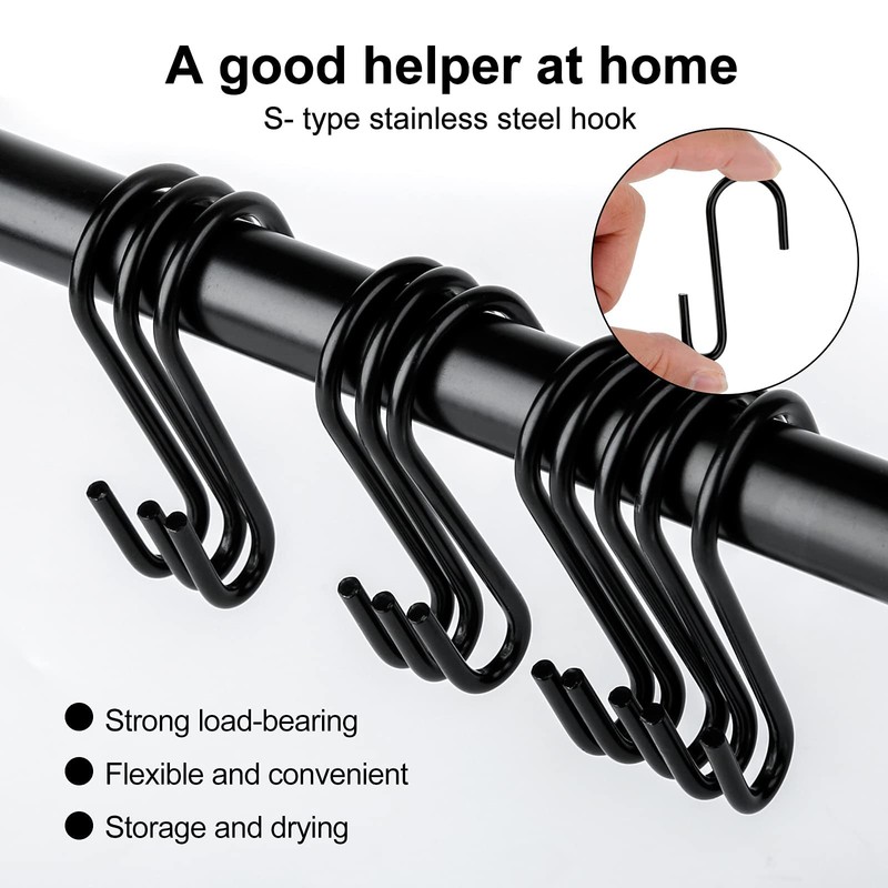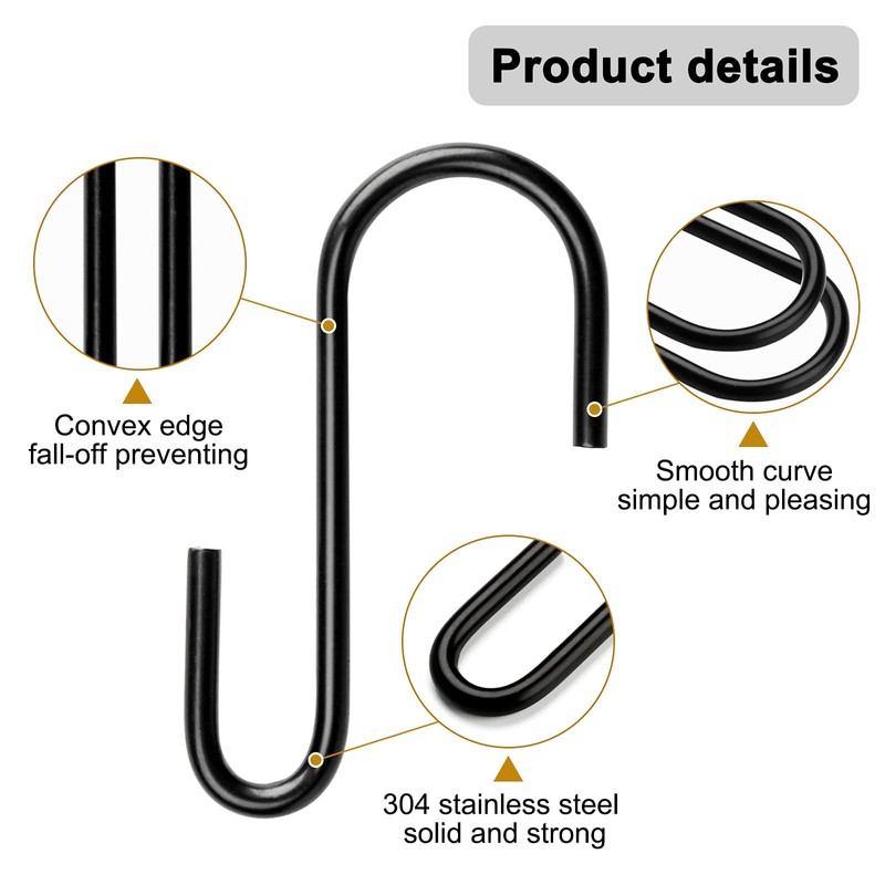 • Great storage solutions for any occasion: The S hooks black can be used in the kitchen for storing various pots and pans, in the living room for hanging clothes and jeans, in the bathroom for hanging towels and gloves, decorating your outdoor relaxation room for hanging baskets and lights, etc.