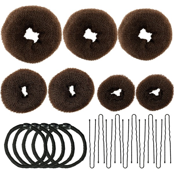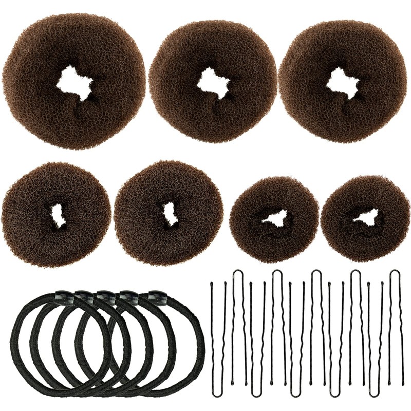 Donut-Brotbackautomat, Haarbrötchen-Maker 7-teiliges braunes, ringförmiges Set, mit 10 U-förmigen Clips, 5 elastischen Haarseilen.