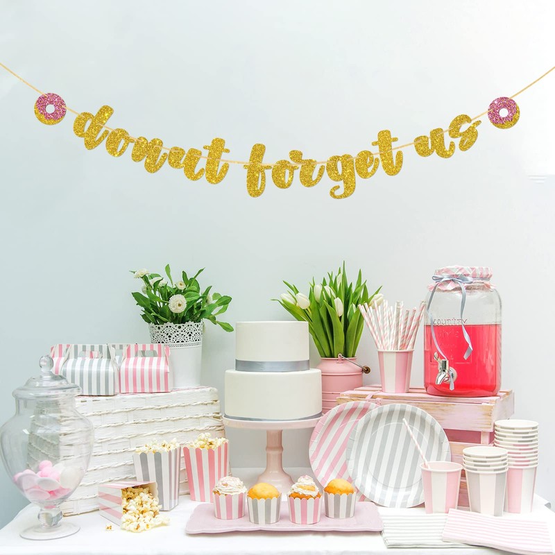 Donut Forget Us Banner, Going Away Decor, Fiesta / Farewell / Career Change / Bachelorette / Retirement Party Decorations Supplies - Gold Glitter