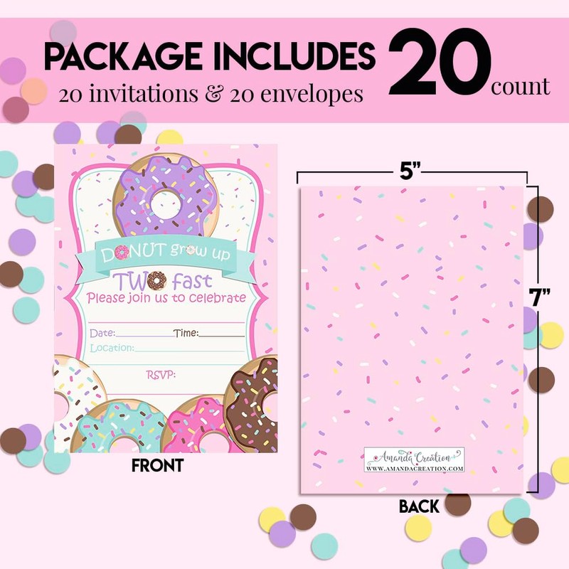 - Cuteness Overload: Designed by a talented mom, these colorful cards feature delicious donuts with frosting and sprinkles - complete with a funny pun about how quickly your 2nd Birthday girl is growing up. These are perfect for inviting guests to join in the celebration! Amanda Creation. Original design by Amanda Creation