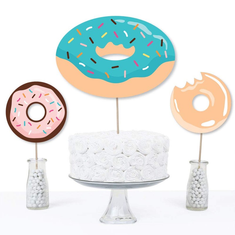 • Donut Worry, Let’s Party Centerpiece Sticks SIZE five donut table toppers, 10.75” wide x 7.5” tall; five donut table toppers, 5.5” wide x 5.5” tall; and five donut table toppers, 5.5” wide x 5.5” tall. The unique design and variety of pieces makes this table decoration kit an impressive addition to any donut shoppe theme party.