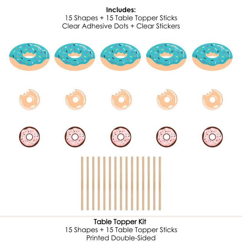 • Donut Worry, Let’s Party Centerpiece Sticks INCLUDES 15 doughnut table toppers in three different shapes, 15 table topper sticks and stickers for easy assembly. Donut sprinkle party table decorations are perfect for a baby, bridal shower or birthday party.