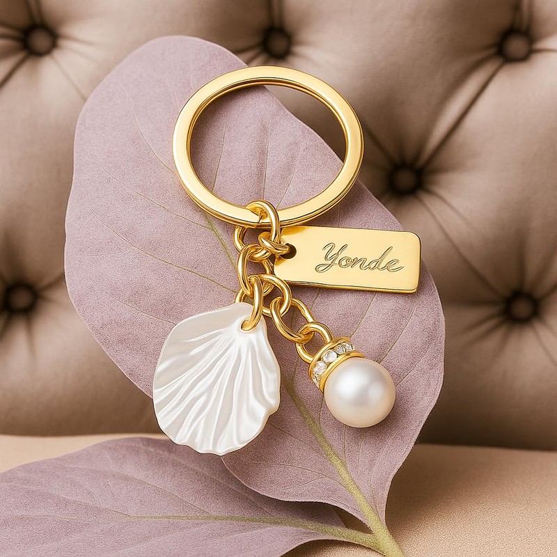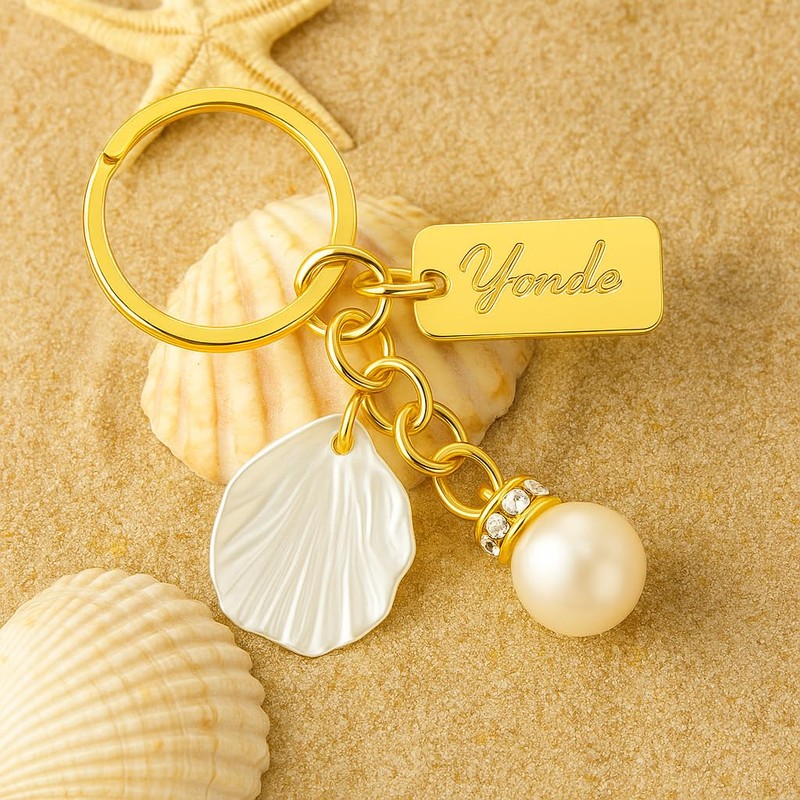 - Charming and Elegant Design: This keychain features a gold metal ring with a shell-shaped pendant, a diamond-embellished pearl charm, and a gold tag engraved with meaningful text, creating a sophisticated and stylish accessory.