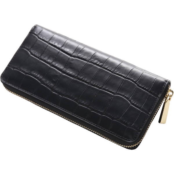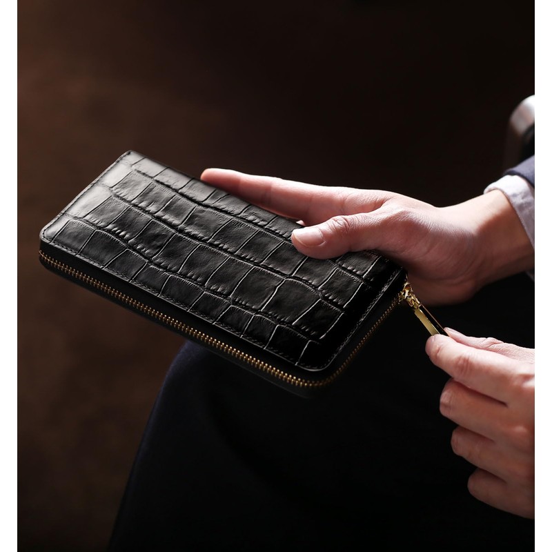 Round zipper long wallet with crocodile embossed design on cowhide leather.