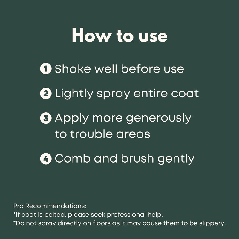 - 5. LONGER-LASTING CLEANLINESS - Say goodbye to frequent baths. Our dog detangling spray keeps your dog's fur cleaner for longer periods, reducing the need for constant grooming. Enjoy a cleaner and fresher pet, with less time and effort spent on grooming.