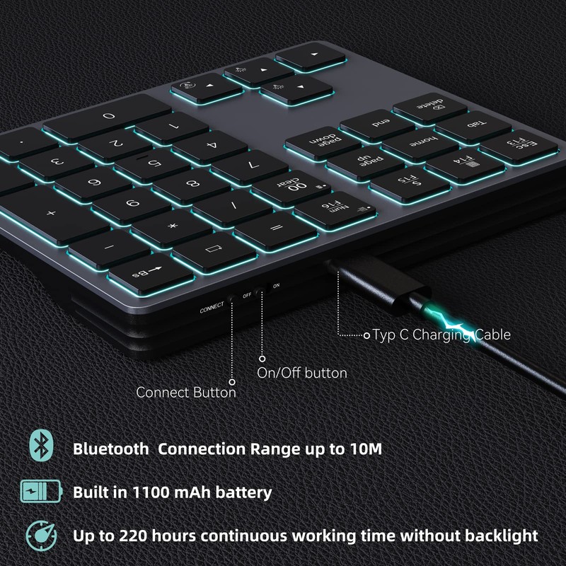 Doohoeek Backlit Bluetooth Numeric Keypad for Laptops and Computers, Number Pads 34 Keys with 7-Color Backlight for MacBook & Windows, Gray