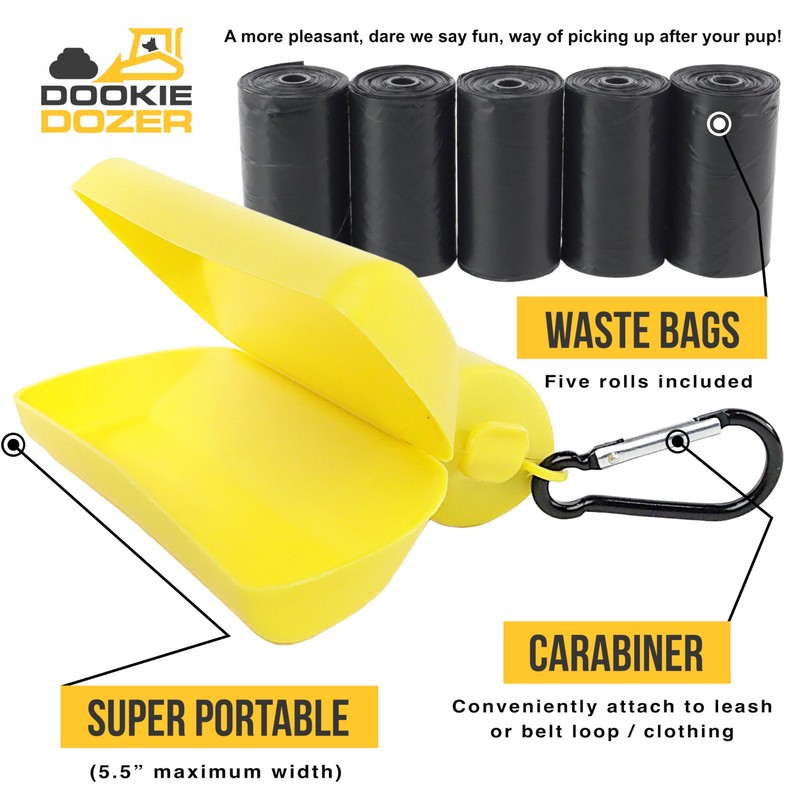 Dookie Dozer Innovative Dog Pooper Scooper with 5Pcs Rolls Dog Poop Bag - Innovative Poop Claw and Waste Bag Dispenser In One Compact Portable User Friendly Device - Carabiner Easily Attaches to Leash