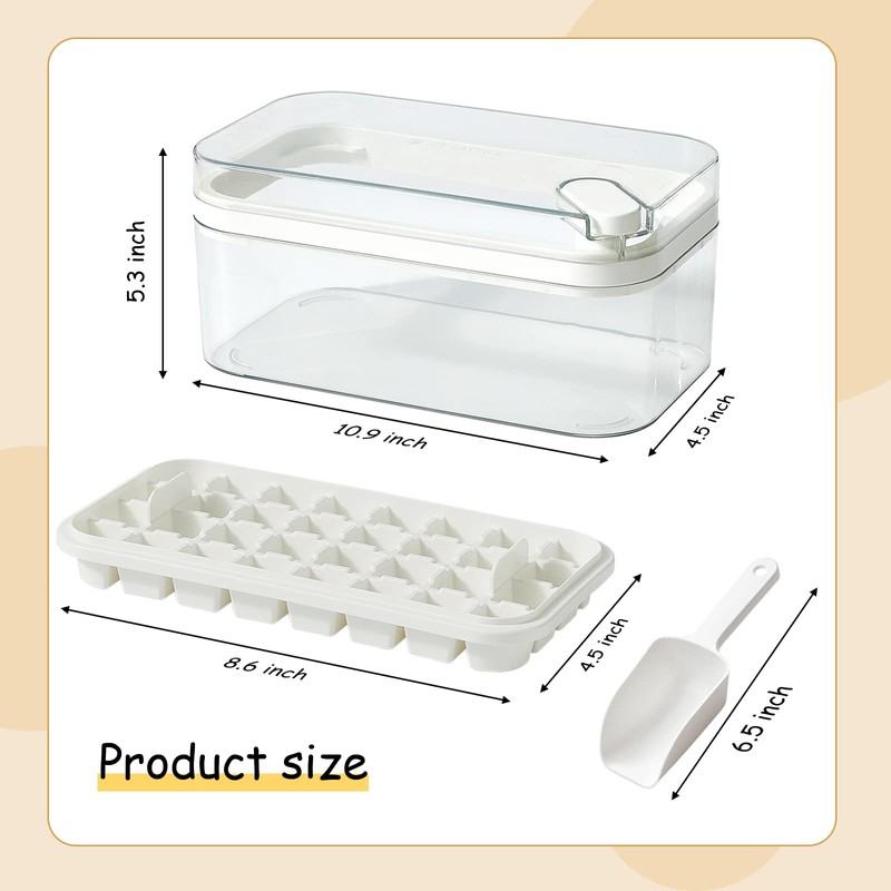 • Package: The package contains two 32pcs green ice trays, a clear container and clear lid, and an ice scoop. You can store the ice cubes with the transparent container.