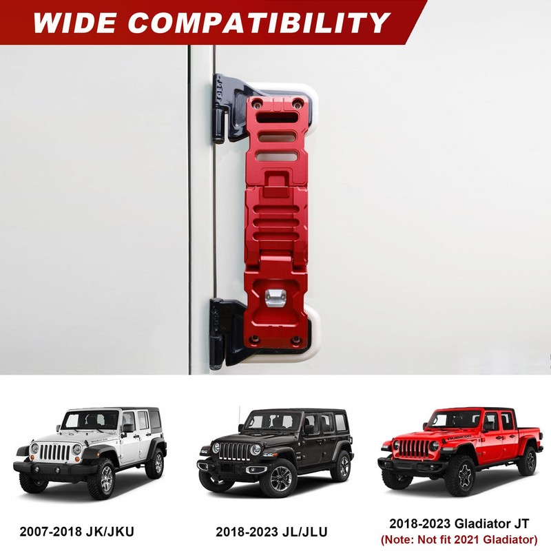 Fitment: The door hinge step for 2007-2018 Jeep Wrangler JK/JKU, 2018-2023 JL/JLU, 2018-2023 Gladiator JT. Note: Not fit 2021 Gladiator