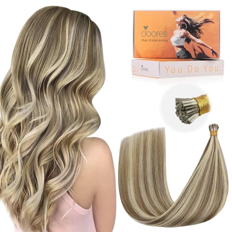 DOORES ITip Human Hair Extensions, Light Brown Highlighted Medium Blonde 50g/100s 16 Inch, Straight Cold Fusion Real Hair Extensions