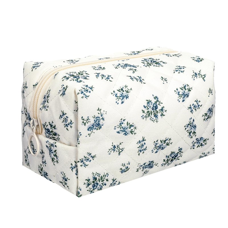 DOPENSPI Cute Makeup Bag, Quilted Cosmetic Bags Quilted Cotton Pouch with Zipper Large Travel Toiletry Bag Kawaii Coquette Make Up Pouch for Women Girls(Floral)