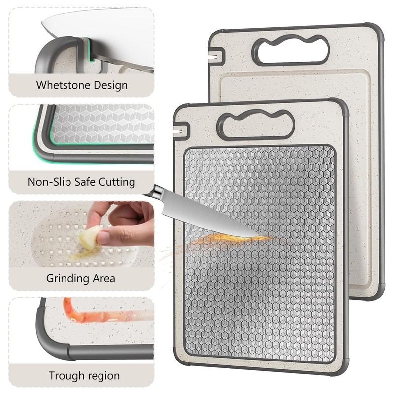 - 【Multifunktionales Design】: Das Schneidebrett Titan verfügt auch über die Funktionen Messerschärfen, Knoblauchmahlen und Führungsnut, die Ihnen helfen, Zutaten effizienter zu schneiden. Die Führungsnut kann ein Überlaufen des Safts verhindern und ihn sauber halten. Das Doppelseitiges Cutting Board ist mit Gummi und Kunststoff umgeben, um sicherzustellen, dass die Schneidebretter stabil ist und beim Gemüseschneiden nicht verrutscht und rutschfest und stoßfest ist.