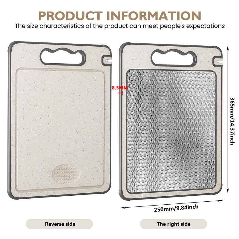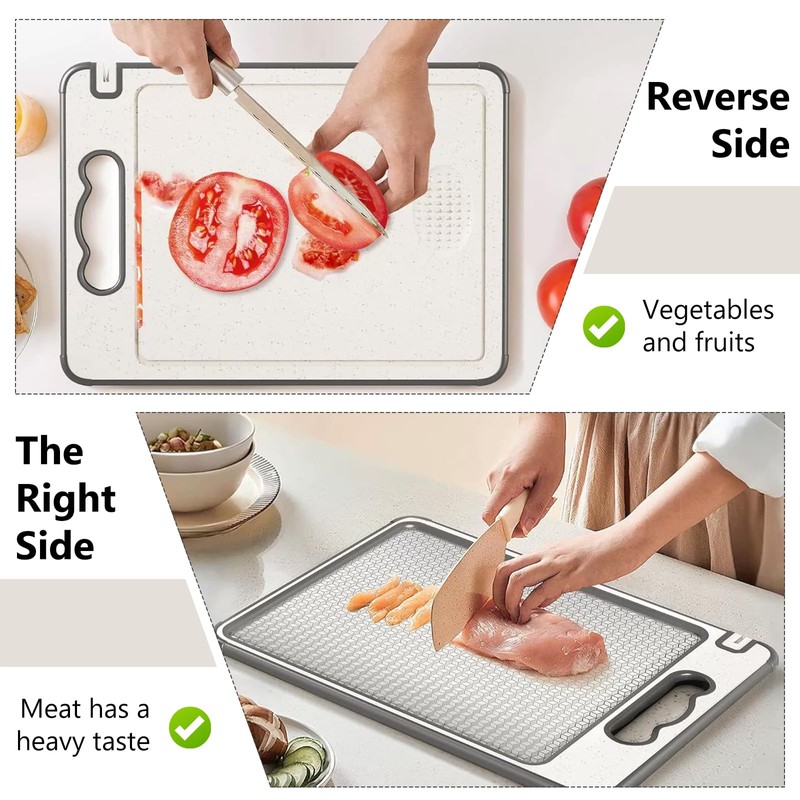 1. Doppelseitiges Schneidebrett, eine Seite ist zum Schneiden frischer Zutaten wie Fleisch und Fisch vorgesehen, und die andere Seite eignet sich zum Schneiden von Gemüse, Obst und anderen trockenen Zutaten, wodurch Kreuzkontaminationen wirksam vermieden und die Zutaten frisch und hygienisch gehalten werden.