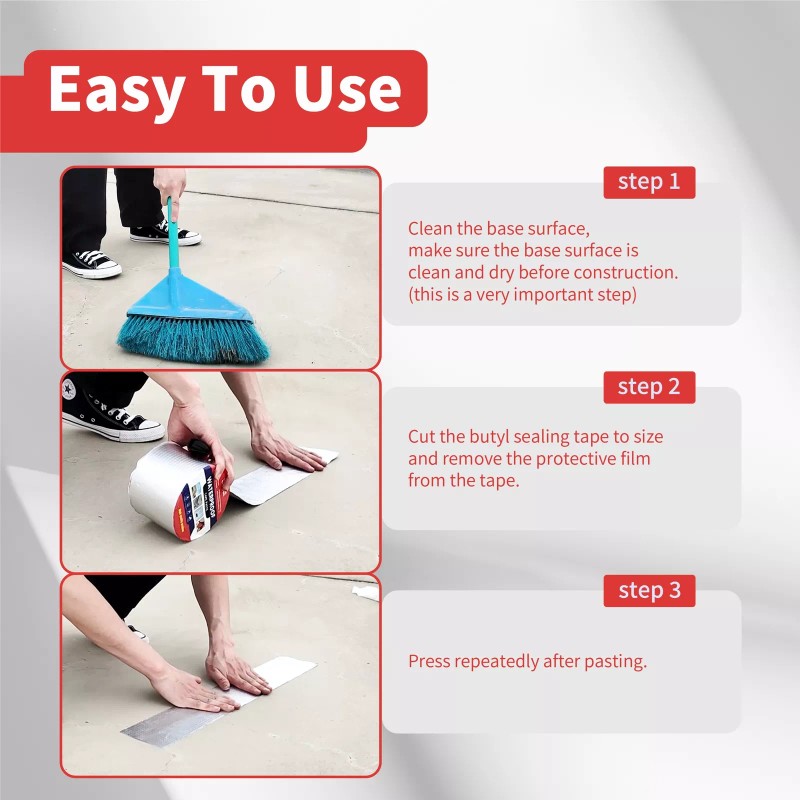 EASY TO USE--Before you ues, make sure the construction surface is dry, clean and no impurities. Peel off the released film and then apply this butyl sealant tape to the surface. Please kindly note it is not suitable for surface of high water pressure.