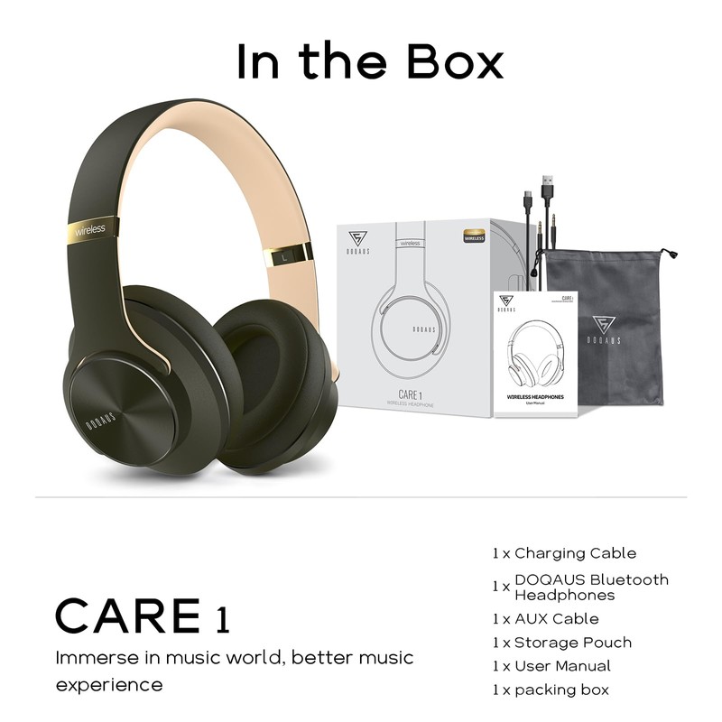 - 【Adjustable Portable Design & Package List】Adjustable headband are ergonomic design, which fit for every head shape. Foldable design makes it easy for you to take the headphones whenever they go. You'll get 1 X DOQAUS Bluetooth Headphones Over Ear; 1 x AUX Cable; 1 x Charging Cable; 1 x Storage Pouch;1 x User Manual