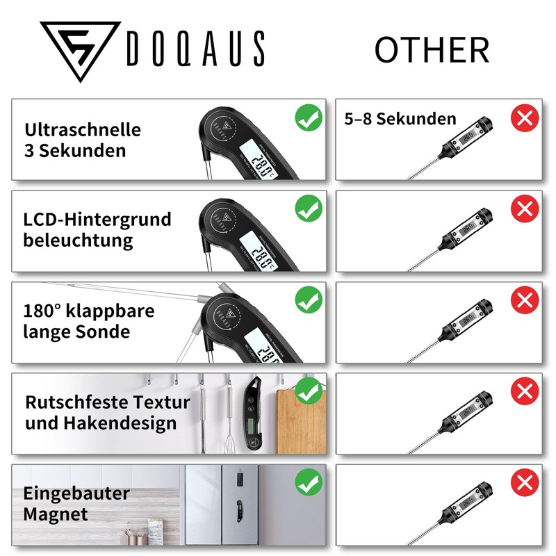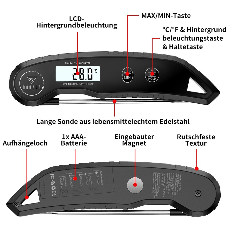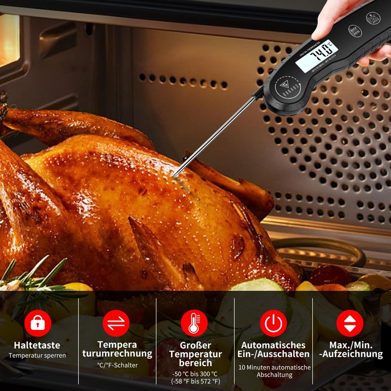 - Foldable punching probes: with the extra long 11 cm long and 180 degree rotating stainless steel probe, you can measure the temperature of food at any angle and it is well protected from scalding; the non-slip design housing ensures a perfect grip. With the instructions of the cooking thermometer on the packaging, you can choose the desired degree of doneness