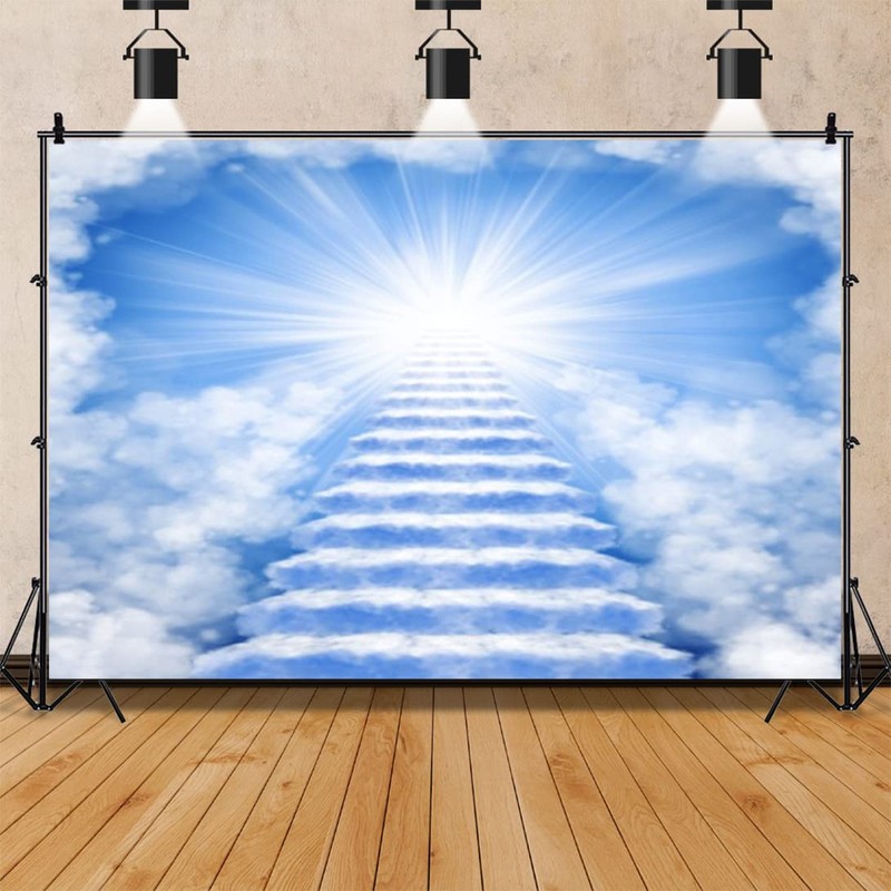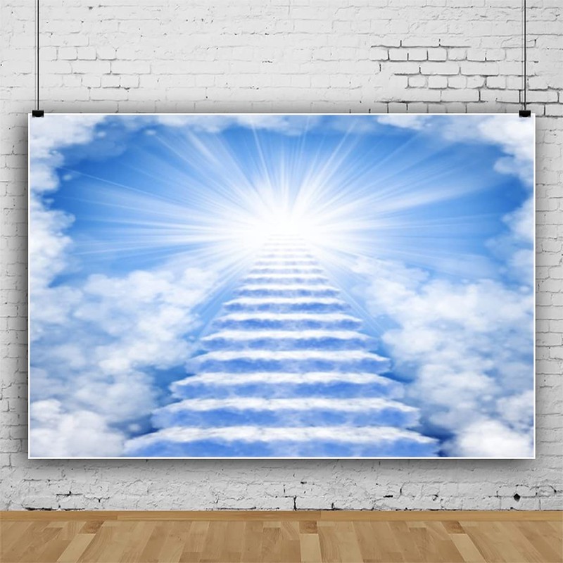 DORCEV 10x7ft Heaven Backdrop Stairs to Heaven Paradise God Bless Backdrop Banner Heaven Sent Theme Background Decor Holy Light Blue Sky Clouds Church Events Memory Backdrop Rest in Peace Backdrop