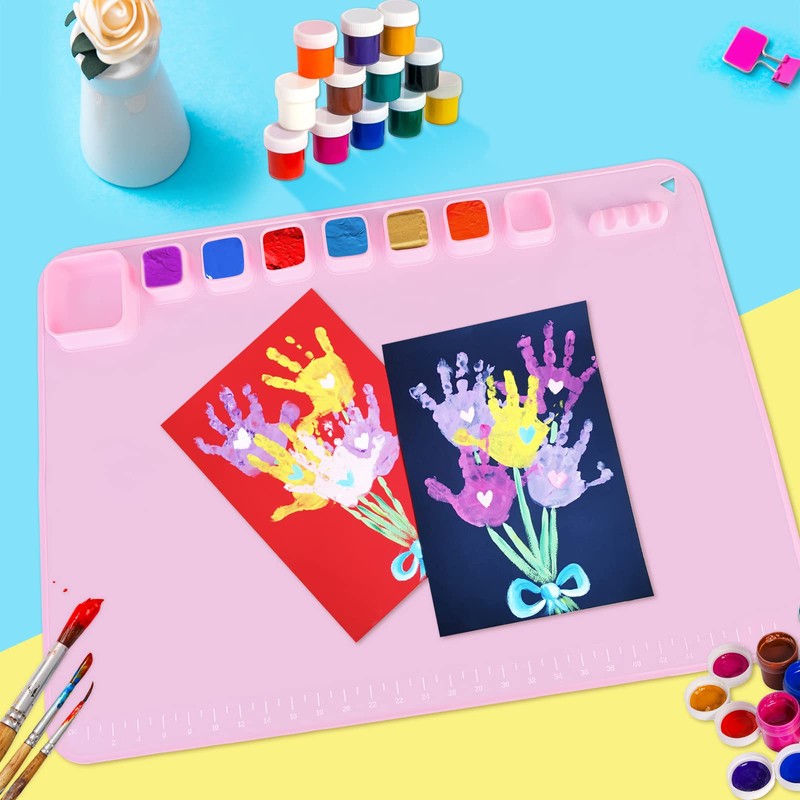 - Silicone Craft Mat Set - You will get a 20" x 16" inch silicone craft mat with 8 paint trays to hold multiple colors , 2 painting brushes, 1 storage bag. It has a collapsible cleaning cup with raised bottom for quick brush cleaning.