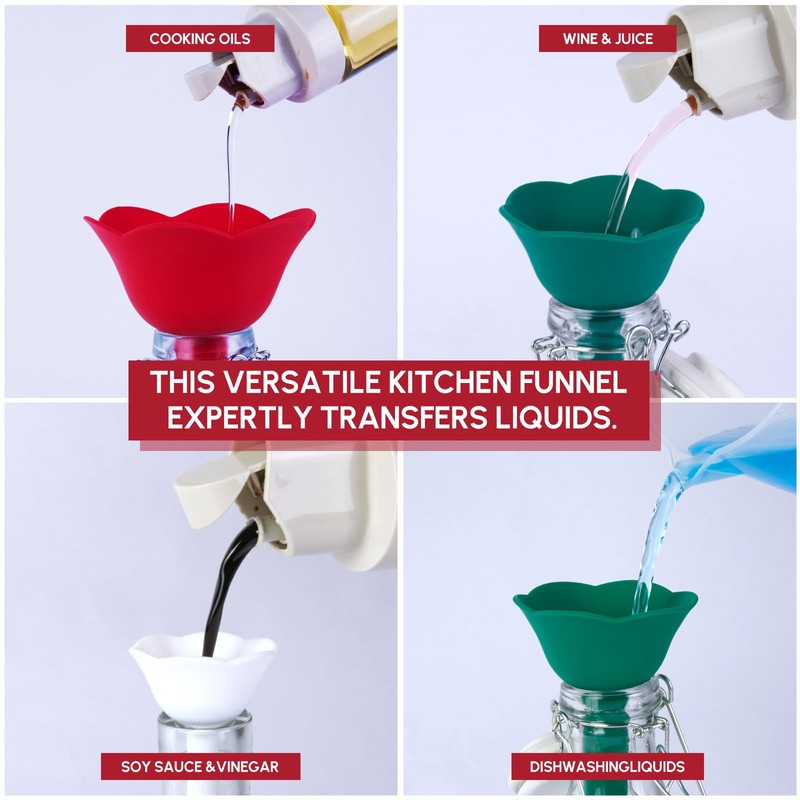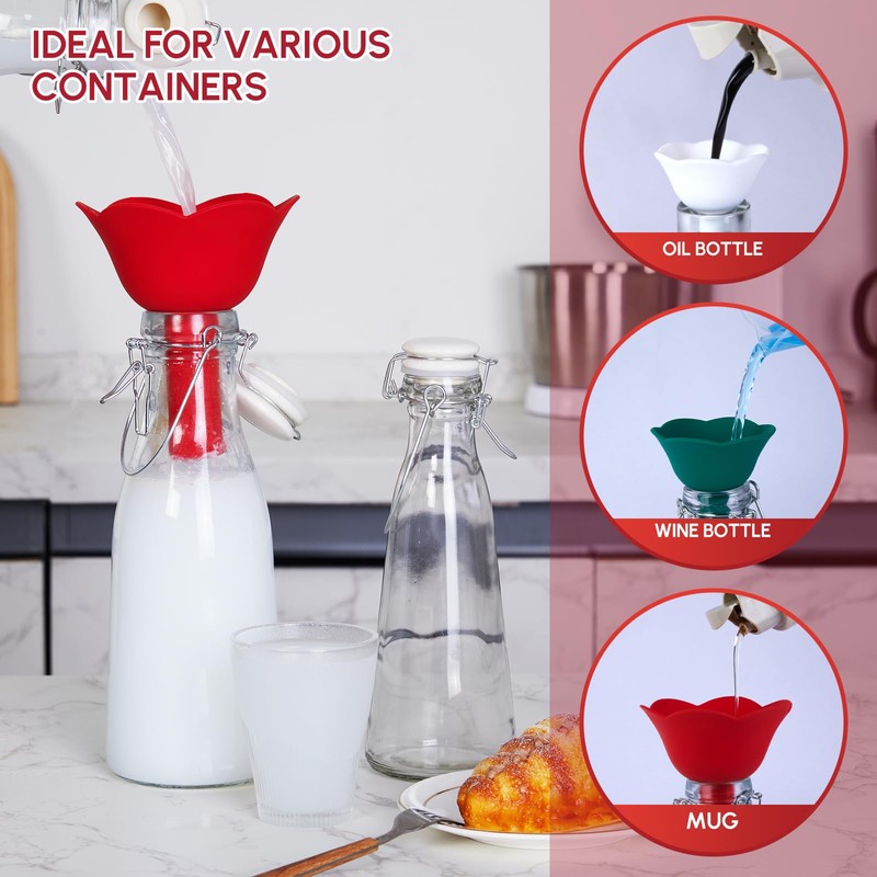 • A Must-Have Kitchen Tool With its charming design and wide-mouth, flexible silicone material, this funnel makes kitchen tasks enjoyable and mess-free! Plus, it's BPA-free, ensuring your food and liquids remain safe.