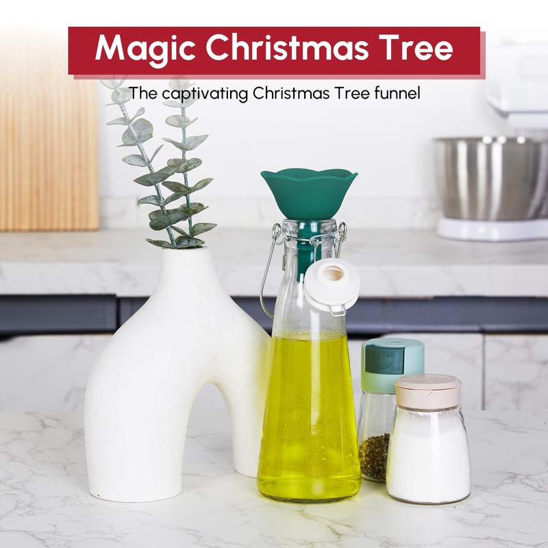 • Stylish and Spill-Free Design – Our Christmas Tree Silicone Funnel ensures not a single drop of liquid will escape! This whimsical funnel turns the task of transferring liquids into a fun activity, keeping your kitchen counters spotless. Simply insert the stem into the bottle neck, flip up the tree head, and pour away!