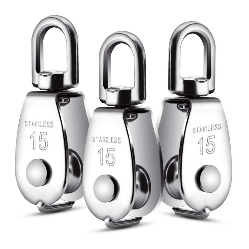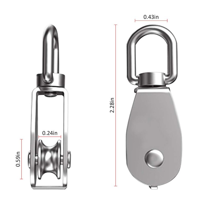 Features \- Material: 304 Stainless steel. \- Size: 2.36 * 0.59 * 0.23 inch \- High Quality: Anti-rust and wear-resistance with highly strong structure. \- Ergonomic Design: 360 degrees rotation to prevent rope from knotting for convenient use. \- Delicate Appearance: Wear and scratch resistance with gorgeous gloss. \- Convenient to Use: Flexible sliding pulley with heavy load capacity for numerous application.