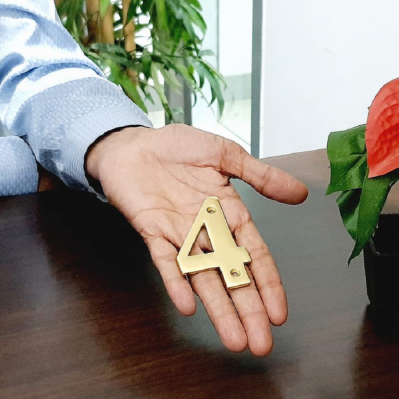 - The pure brass stylish outdoor decor address plaque number 4 (four) indicates a house number or street address and helps people locate a premise with ease. These house number plaques modern house numbers have a lacquered polish finish brass finish. These Mailbox letters address plaques for house numbers measuring 3 Inches (7.5 cm address numbers for the mailbox) High.