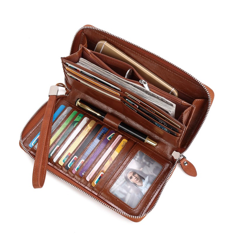 - LARGE CAPACITY: 17 credit card slots, 1 ID window with central cut out over, 1 zipper pocket for change, 2 currency pockets and one pen loop, this wallet is suitable for cash, coins, cell phone like as iphone7/8 plus, passport, pen, checkbook and with a detachable wristlet strap.