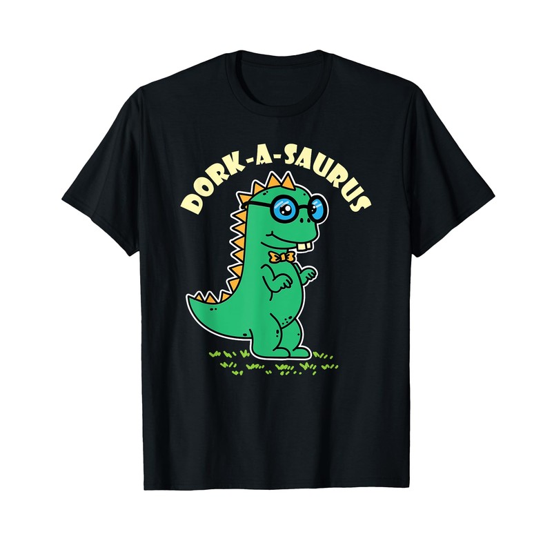 - A dino design that features a glasses-wearing dinosaur and the saying "Dork-A-Saurus". For the nerdy person or paleontologist that loves dinos.