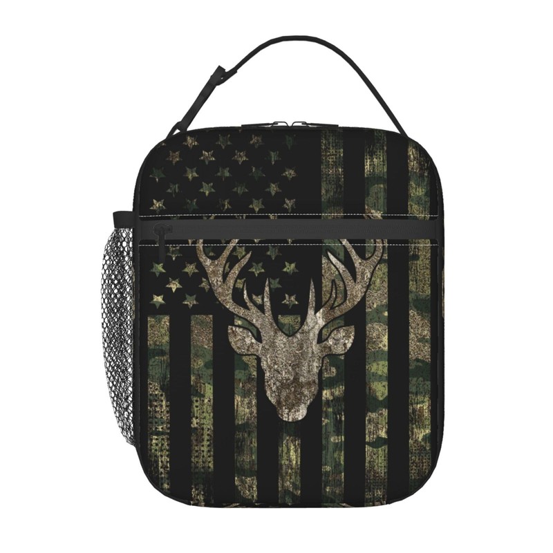 DORKEIXIA Camo Camouflage American Flag Hunting Deer Insulated Lunch Bag Portable Reusable Zipper Lunch Box For Men Women Work Picnic Travel Camping