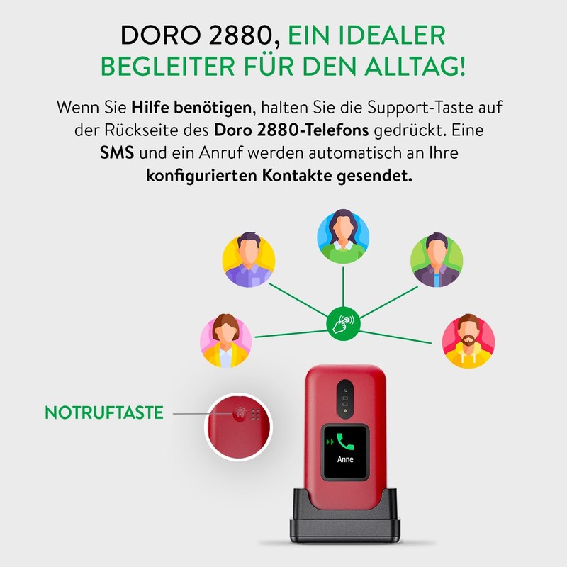 - Support Button When you need help, press and hold the assistance button on the back of the Doro 2880. An SMS and support call will be automatically sent to your configured contacts.