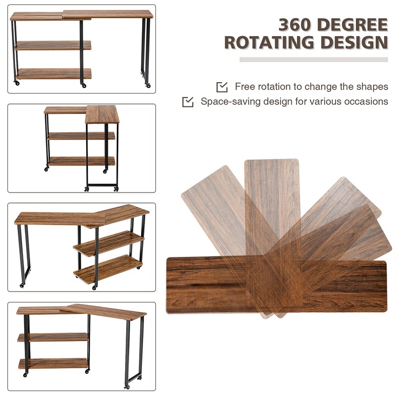 The multifunctional table serves as a side table, as well as a tea table. The free rotating design meets your different needs. When extended to 180 degree, the corner desk offers spacious space for displaying books, photo frames and other items you may have. When overlapping, it can save space. Besides, it also offers large storage space with spacious table top surface and 2-tier storage shelf. Thanks to the smooth rolling casters, 2 of which are designed with brakes, flexible mobility and reliable safety can be easily achieved simultaneously. Sturdy structure with thickened iron pipe is capable of keeping it durable enough for long-term rough use.