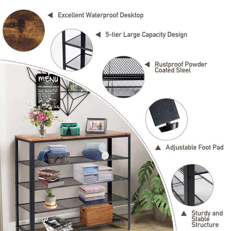 - 【Extra Large Capacity】 This 5-tier shoe rack consists of 4 metal mesh shelves and a wide top to help keep your room tidy. 4 shelves offer ample storage space to hold your sneakers, boots, sandals, slippers and more, while the desktop allows you to display your favorite personal items.