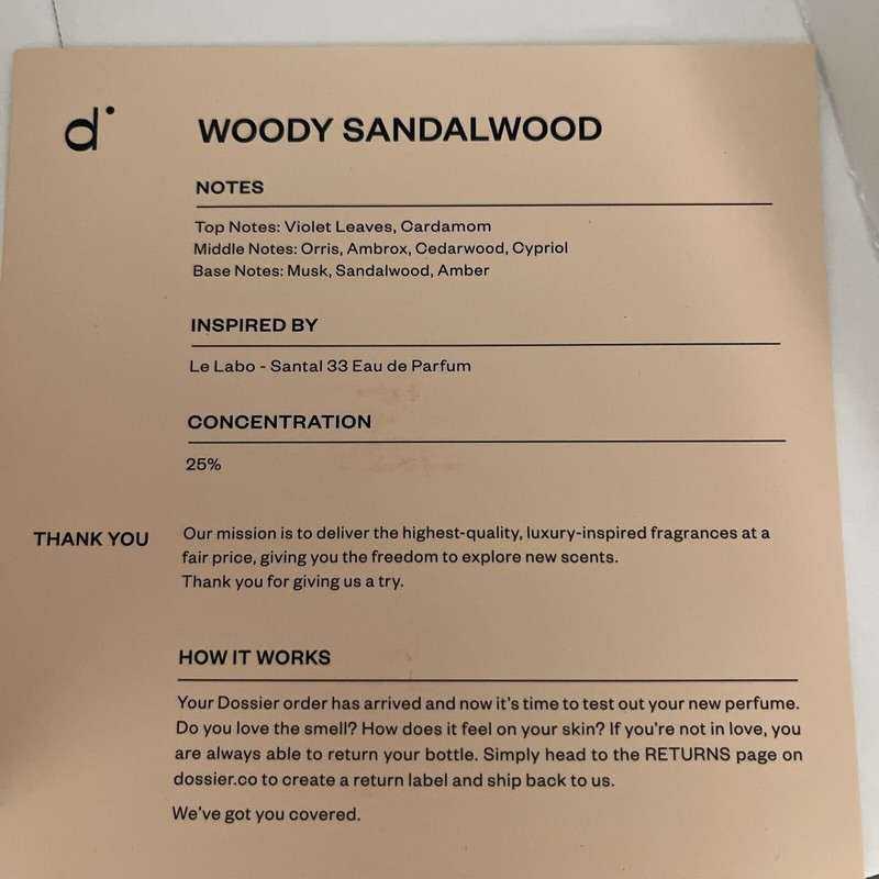 UNISEX Dossier Woody Sandalwood Eau de Parfum 1.7 Fl oz / 50 mL. This is new in box. Please see all pictures, what you see is what you will receive!