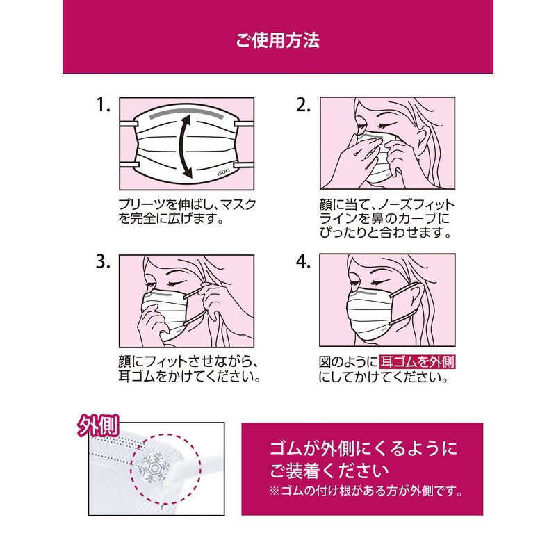 - Precautions for Use: ● This product cannot be used for preventing toxic dust and gas, etc. If you experience itching, rash, or rash, or any other irritation due to the use of this product, stop using and consult a physician or pharmacist. Please stop using this product if you feel uncomfortable due to the smell or have a bad breath. Keep out of reach of infants. Avoid storing in places with high temperatures and high humidity or in direct sunlight. If you experience pain or discomfort in your ears while wearing the mask, please stop using it for a moment. If the rubber of the ear is tight, please stretch it lightly and use it. The mask is a one-use type, so please do not wash and reuse it. The material is extremely soft, so depending on the conditions of use, there may be cases of pilling non-woven fabric. It does not harm your health, but please use a new one. Please note that there may be slight differences in the size due to the manufacturing process