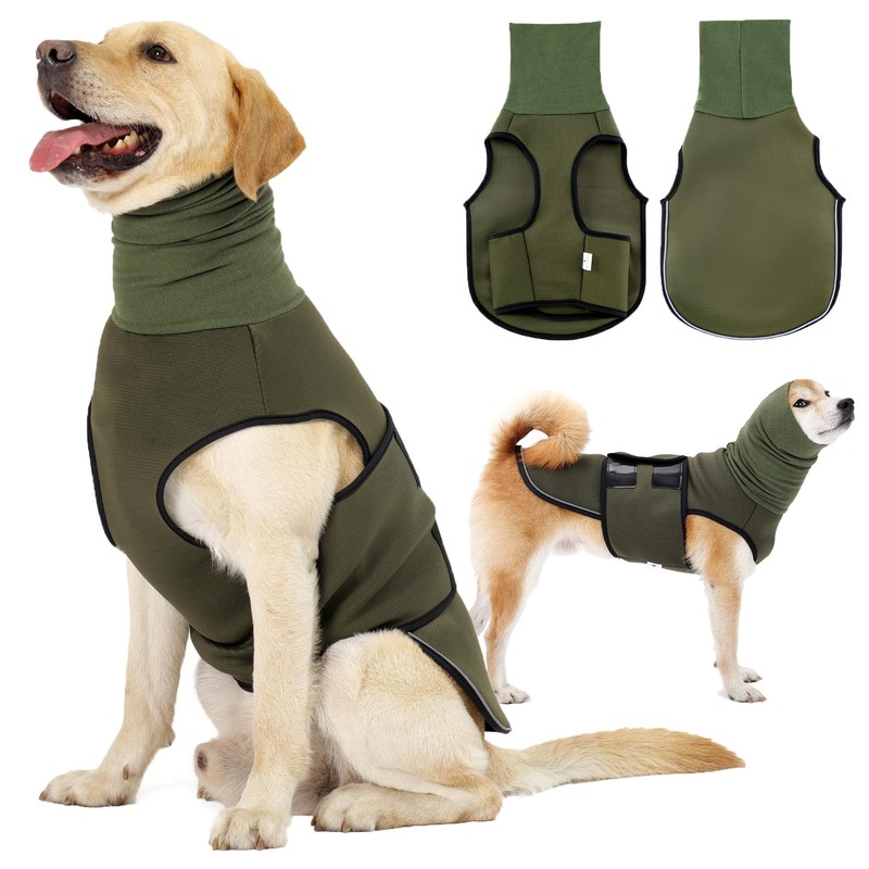 - Protection from the elements: with high collar protection from cold weather and wind, provides UV protection, keeps your dog clean when outdoors or in the dog park or on the beach. It is a must when travelling in the car and going on outdoor adventures. Dog soothing coat with reflective strips for extra visibility and safety when your dog walks at night or in low light conditions, outdoors or when travelling.
