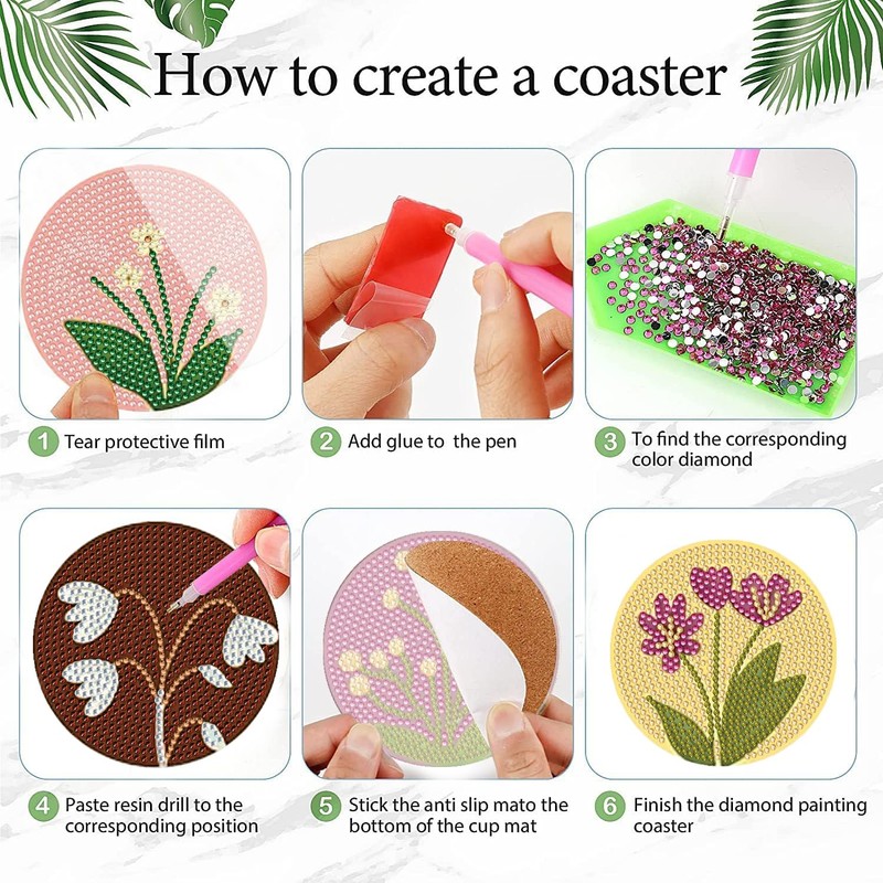 - Complete Set - Package includes 6 Diamond Art Coasters, 6 Cork Pads, 1 Coaster Holder, Colorful Diamonds, 1 Clay Glue, 1 Diamond Painting Pen, and 1 Diamond Tray. Everything you need to create beautiful diamond painting coasters is included, making it an ideal diamond art kits for adults.