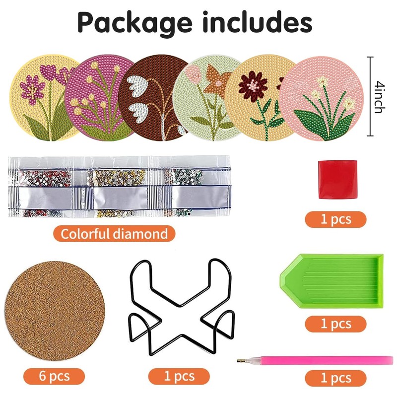 - Complete Set - Package includes 6 Diamond Art Coasters, 6 Cork Pads, 1 Coaster Holder, Colorful Diamonds, 1 Clay Glue, 1 Diamond Painting Pen, and 1 Diamond Tray. Everything you need to create beautiful diamond painting coasters is included, making it an ideal diamond art kits for adults.