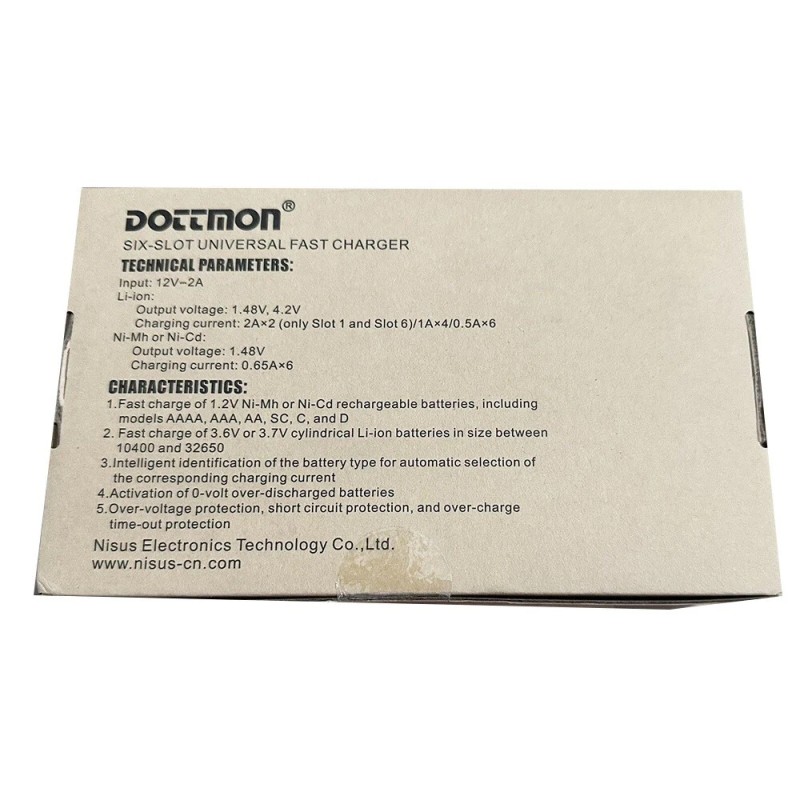 Introducing the Dottmon Six-Slot Universal Fast Charger Model CB-6A – the perfect solution for all your charging needs. This charger is compatible with AAAA, AAA, AA, SC, C, and D batteries, and has a voltage of 1.48. You can charge multiple batteries at once with its six slots, making it a convenient and efficient choice.