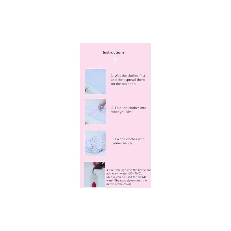 • Fabric Dye Easy to Use: Step 1: Pour the tie dye powder into a container and mix with an appropriate amount of water. Step 2: Apply the dye after mixing the water on cloth then let it rest for 15~30 minutes. Step 3: Take out the cloth, then wash and dry